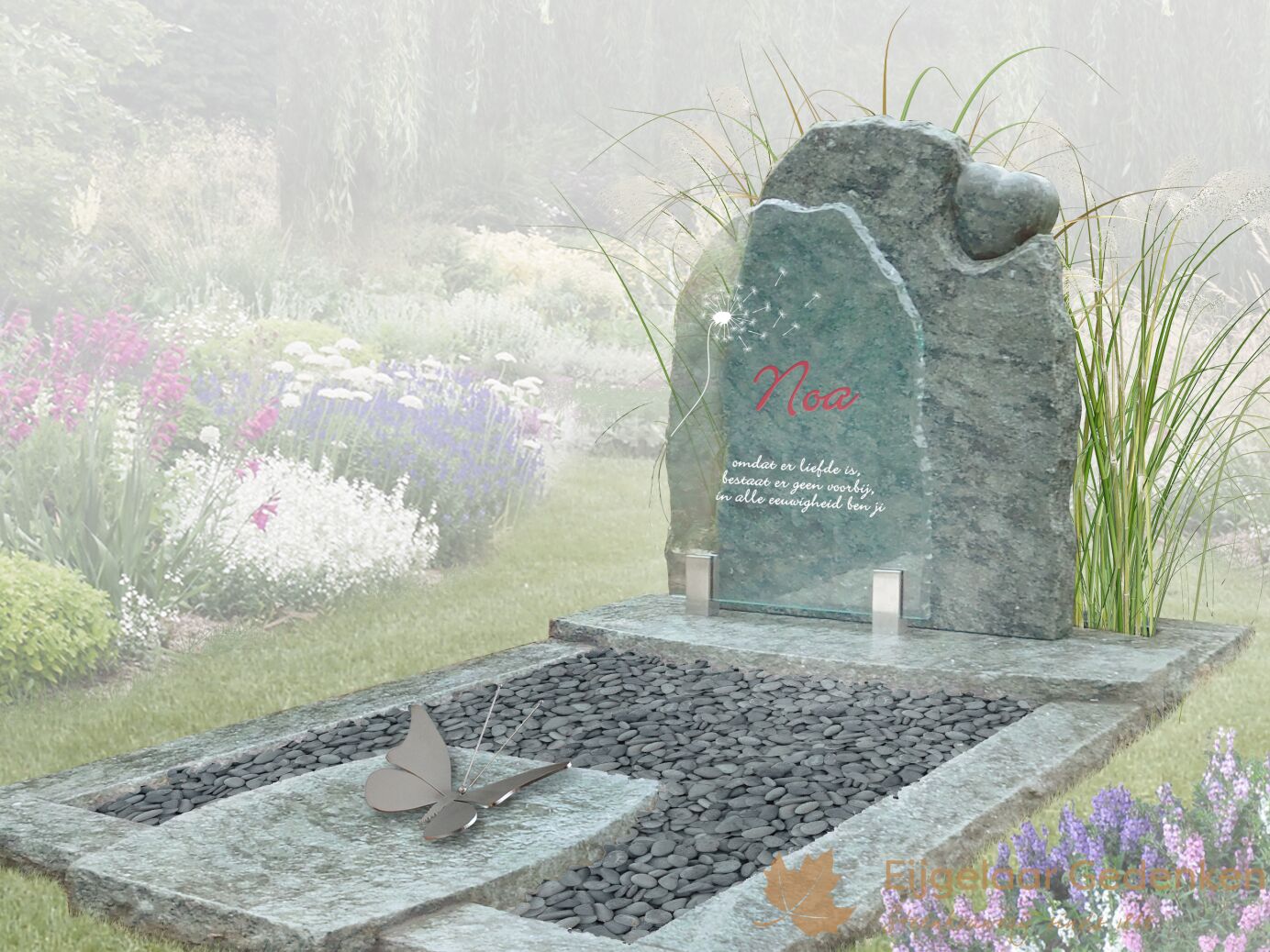 Het gedenkmonument is gemaakt in een grijsgroene natuursteen. In het glas zit ook een zachtgroene tint. De steen is ruw afgewerkt voor een natuurlijke uitstraling. Ook het glas heeft rondom een gebrokkelde afwerking gekregen. Een grafmonument uit de co... lees meer >