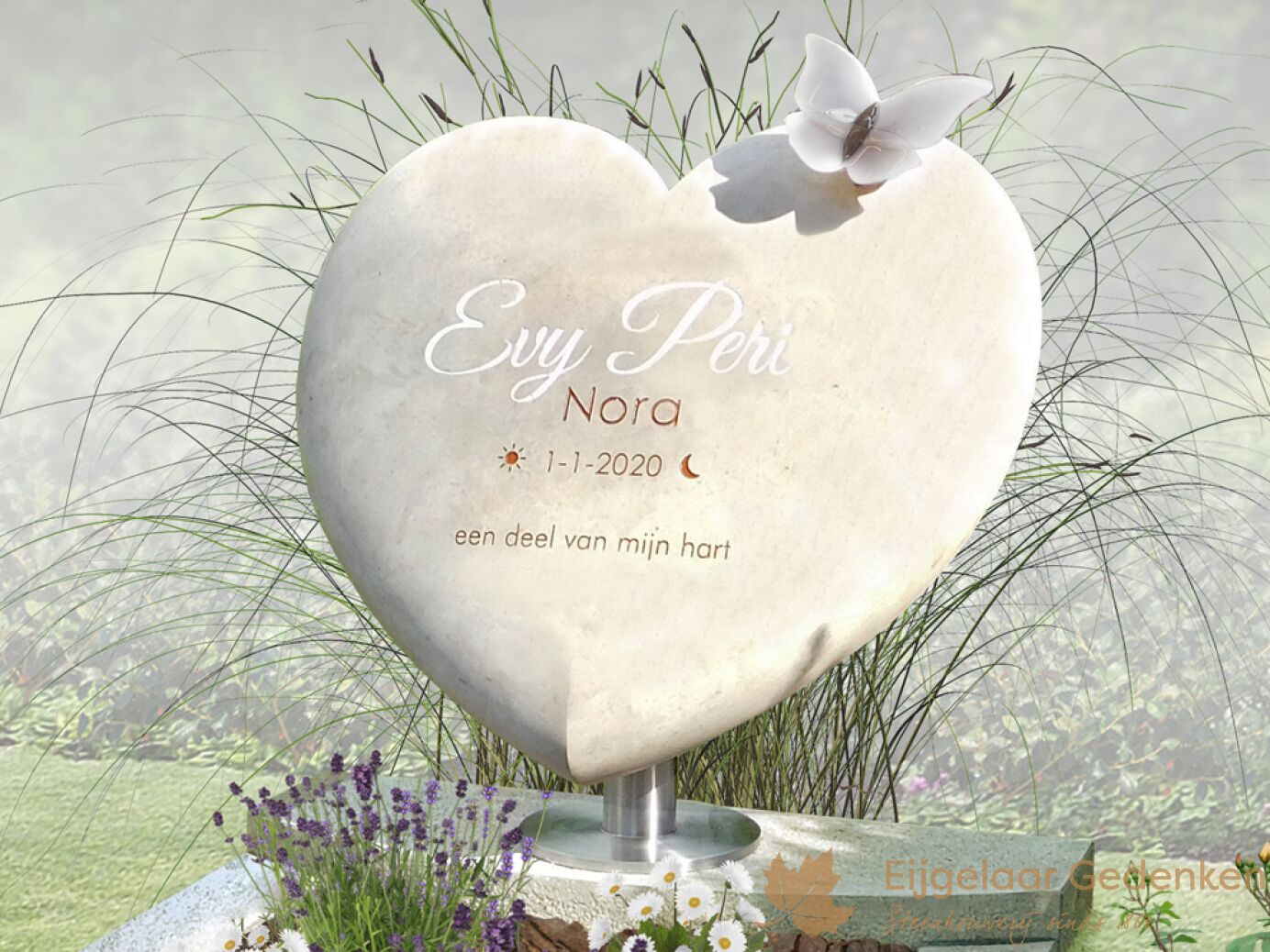 Het hart, symbool van warmte en liefde, is uit kalksteen gemaakt. De ronde afwerkingen geven het een zachte uitstraling. Op het hart rust een lila vlinder, deze is gemaakt van glas en in vele tinten verkrijgbaar.