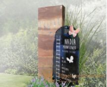 De blauwe glasplaat heeft een geknabbelde rand waardoor deze een wat natuurlijkere uitstraling krijgt. Het glas is wel transparant, maar biedt dankzij de diepe, donkerblauwe kleur veel contrast met de teksten en tekeningen die met wit emaille zijn aangebracht. Naast de naam is er ook voldoende plek voor een persoonlijke tekst. De vlindertjes en de ladder geven het gedenkteken bovendien een extra persoonlijke betekenis. De bovenste vlinder is gemaakt met behulp van glasfusing, waardoor deze de zachte roze kleur en vorm gekregen heeft. Naast de glasplaat is een zuil toegevoegd van een rode natuursteensoort. Het oppervlak is hiervan gezoet, zodat deze glad is afgewerkt waardoor de kleuren intenser worden, maar niet te veel glanst.