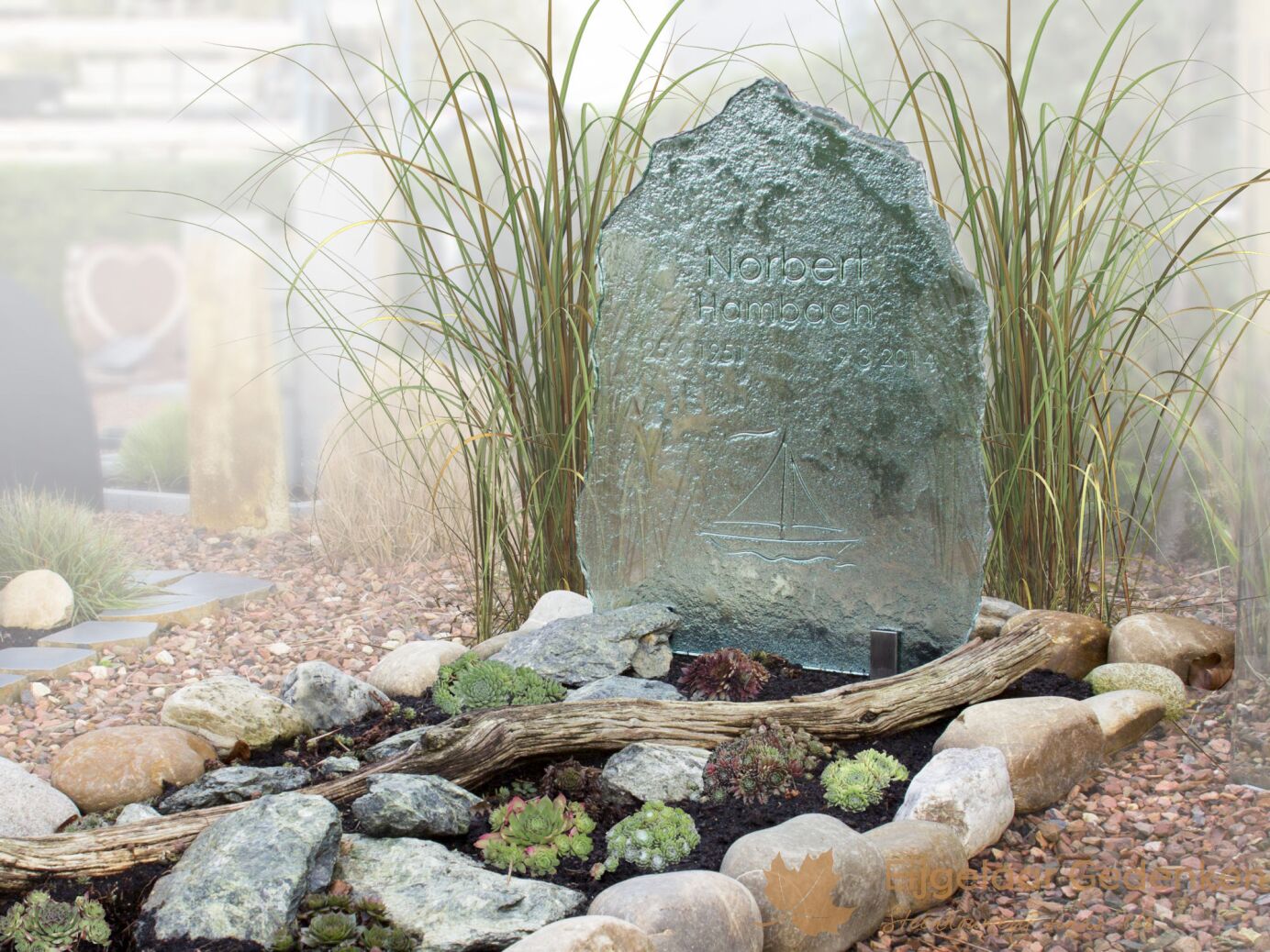 grafsteen een natuurlijk karakter. In het glas is de vorm van een zeilboot gesmolten, u kunt uiteraard ook een ander ornament laten versmelten. De grafsteen wordt bijgestaan door ruwe keien en sedum grafbeplanting, beide doen geen afbreuk aan de natuurlijke uitstraling.