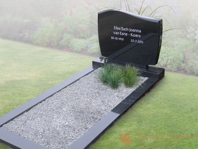 Grafsteen golfkop van zwart graniet. Het natuursteen is gepolijst en als grafbedekking is er gekozen voor split.