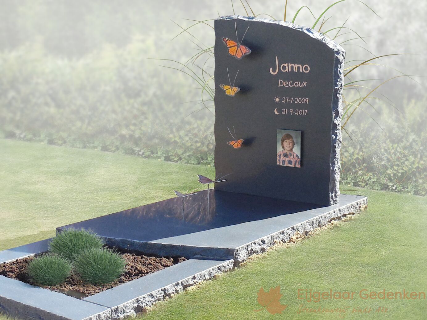 Kindergrafmonument met gekleurde vlinders. Ook op het liggende deel natuursteen zijn 2 vlinders aangebracht waardoor er een vliegroute ontstaat. Het natuursteen is gezoet afgewerkt om het geheel een zachtere uitstraling te geven.