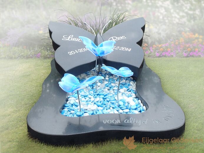 De opvallende witte en blauwe glasparels geven een heel frisse tint aan dit speelse kindermonument. Heel prominent op het korte graf prijkt een grote vlinder van natuursteen dat de naam en andere opschriften draagt. Net als de omranding is het bijna zwarte natuursteen van de grote vlinder mat gemaakt en hebben de randen een subtiel facet gekregen, waardoor het geheel mooi zacht wordt.De lange glooiende vlakken voorkomen dat er ook maar één rechte lijn in het monument zit en dit zorgt voor een speels effect. Er zijn ook drie glazen vlindertjes aangebracht die door de slanke RVS-steunen lijken te zweven boven het graf. De wit met blauwe kleuren zijn geheel versmolten in het glas en dat zorgt ervoor dat de kleur altijd mooi blijft. Dankzij de combinatie van kleuren, de vlindertjes en de glooiende vormen, heeft dit moment een frisse en speelse aanblik.