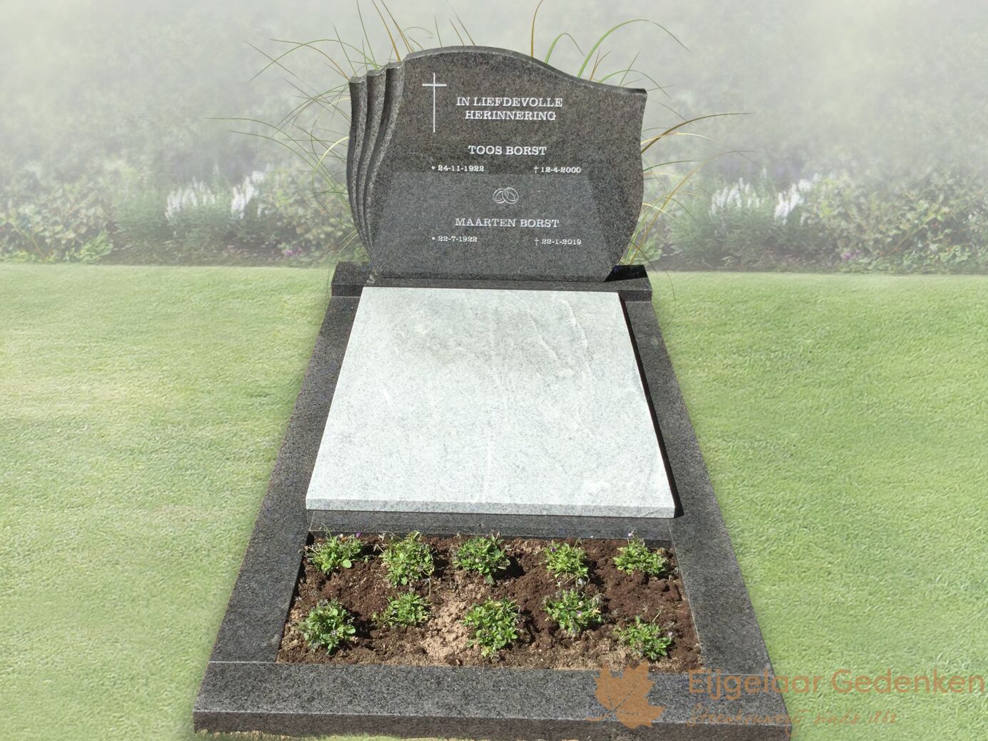 Enkele grafsteen - met vloerEnkele grafmonumenten of grafstenen zoals deze zijn ontworpen voor een enkel breed graf. Hoewel deze grafmonumenten enkel breed zijn, kan het graf wel 2 of 3 diep zijn en dus plaats bieden aan meerdere personen. Afhankelijk van de ruimte voor de belettering kan een enkel grafmonument dus prima plaats bieden aan meerdere namen en opschriften.